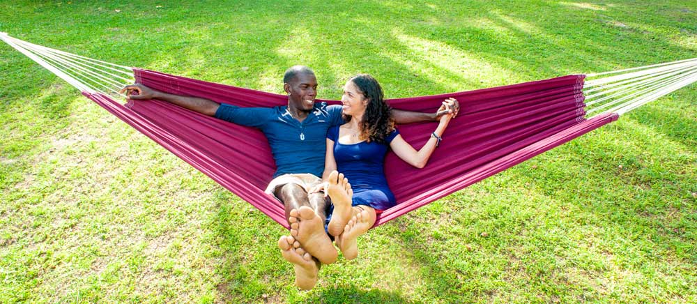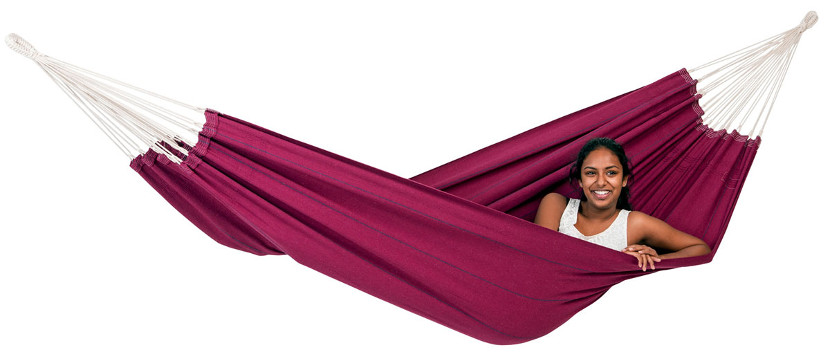 Original Brazilian handicraft! A double hammock with perfect value for money. The 400 g/m² thick material absorbs any sort of heavy weight put on it; length and width give an optimum balance of cost and comfort. And the bright colours and patterns have been our favourites for years.