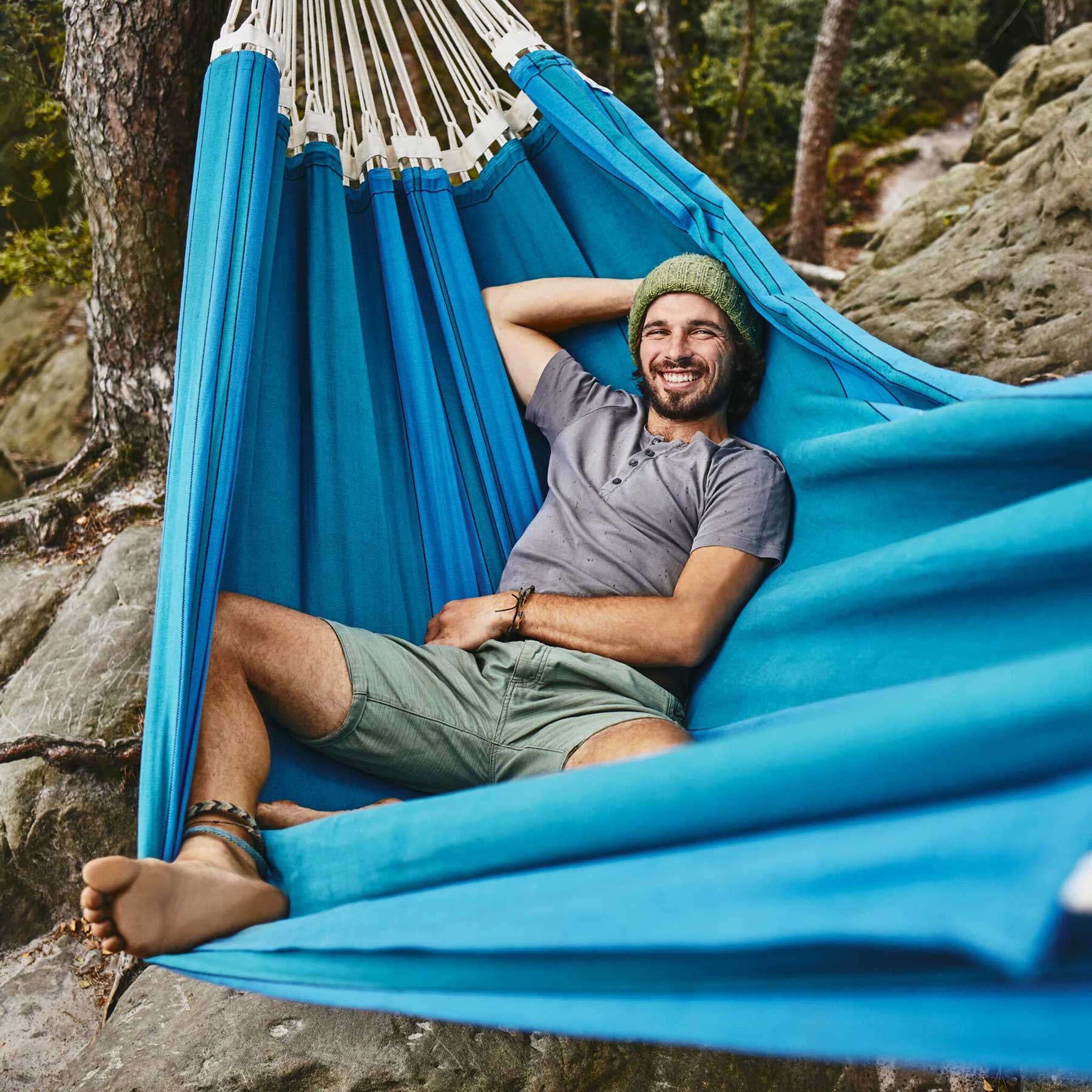 The sturdy, woven cloth and the many extra thick hanging straps, which are reinforced by an additional band at the hammock guarantee a high longevity.